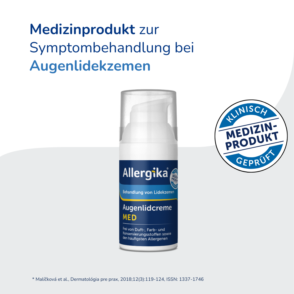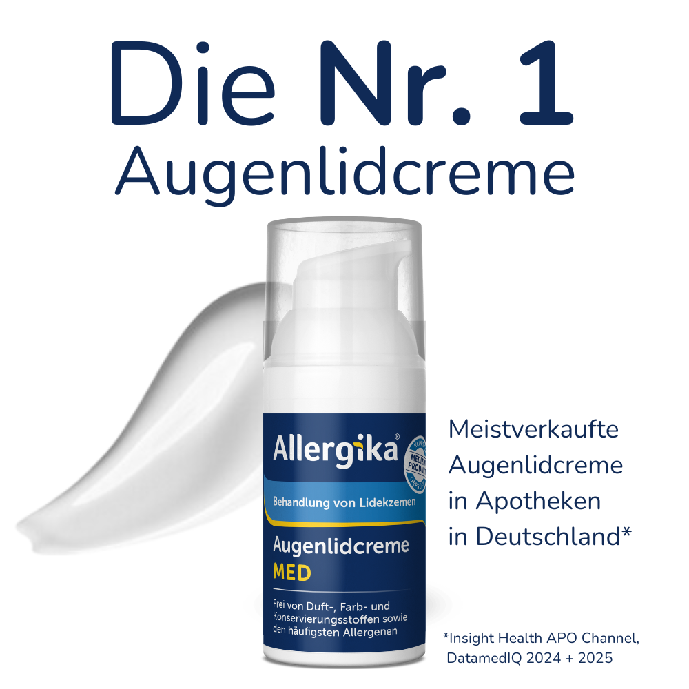 Die Allergika Augenlidcreme MED ist ein kortisonfreies Medizinprodukt zur Behandlung von Lidekzemen, das durch klinische Studien belegt eine hohe Wirksamkeit aufweist. Innerhalb von nur drei Wochen konnte bei 75 Prozent der Anwender ein signifikanter Rückgang von Rötung, Schuppung und Hauttrockenheit festgestellt werden.*